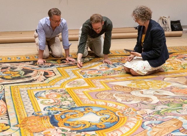 Wolf Burchard, Antonin Macé de Lepinay, and Elizabeth Cleland examine the Tapis Grande Galerie du Louvre in the Mobilier national, 2023; photo: Justine Rossignol.